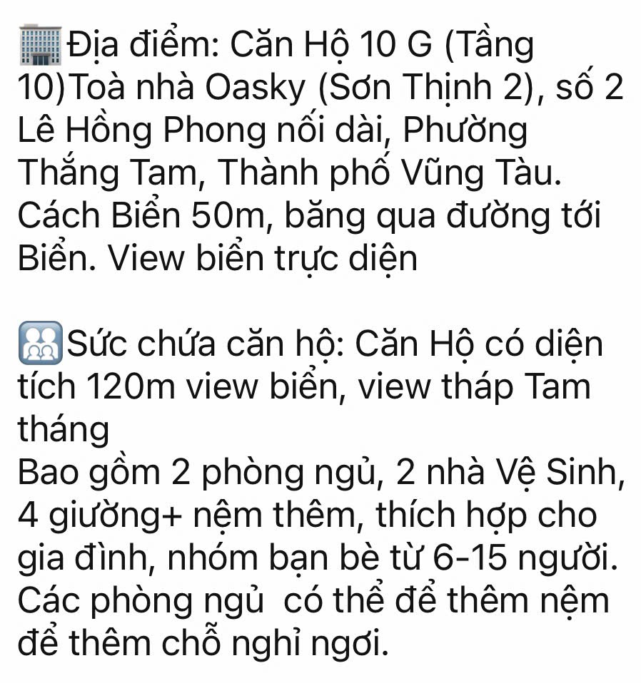 Căn Hộ Oasky 10G Vũng Tàu giá rẻ - Chính chủ cho khách du lịch thuê theo ngày Homestay Oasky Vũng Tàu giá rẻ - Hotline tư vấn đặt phòng tại Chung cư Oasky Vũng Tàu: 0908 137 236 Chính Chủ chuyên cho khách du lịch thê theo ngày Căn Hộ Oasky giá rẻ, Chính chủ cho thuê Homestay Oasky cam kế luôn có giá thuê cạnh tranh tốt bậc nhất thị trường Vũng Tàu. Liên hệ ngay để được tư vấn đặt phòng Chung Cư Oasky Vũng Tàu tại địa chỉ số 2 Lê Hồng Phong, Phường Thắng tam, Vũng Tàu. Hotline tư vấn: 0908 137 236