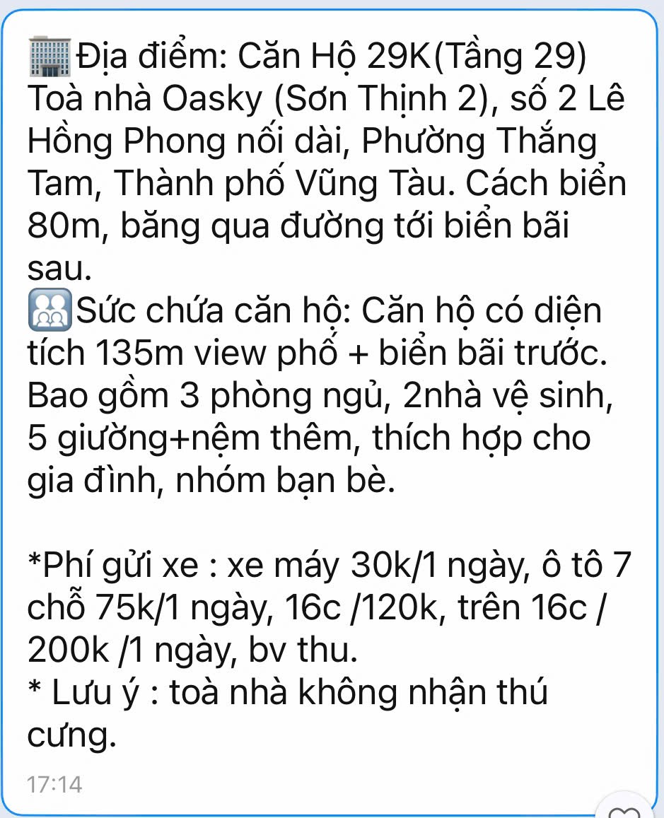 Căn Hộ Oasky 29K Vũng Tàu giá rẻ - Chính chủ cho khách du lịch thuê theo ngày Homestay Oasky Vũng Tàu giá rẻ - Hotline tư vấn đặt phòng tại Chung cư Oasky Vũng Tàu: 0908 137 236